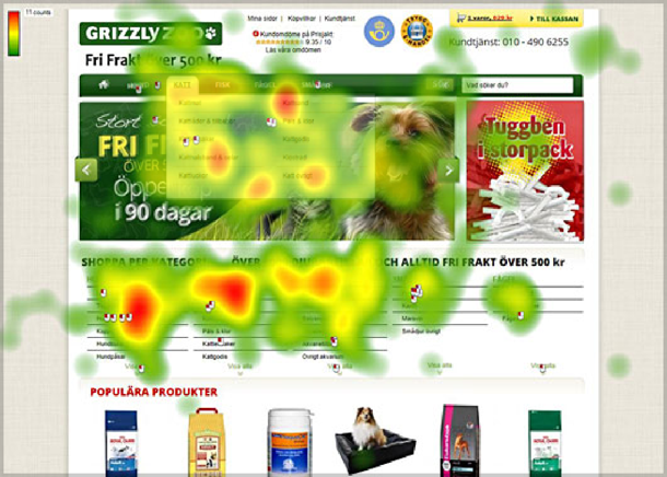 Hieronder ziet u een afbeelding van een heatmap waarbij het aantal kliks gebeuren op een homepage. Hierbij zien we dat de slideshow volledig genegeerd wordt. In ons onderbewust zijn scannen we een webpagina en gaan we reclame en promoties over laten en kijken naar andere inhoud. Hier zien we dat de navigatie en de inhoud onder de slideshow vooral veel gebruikt wordt.